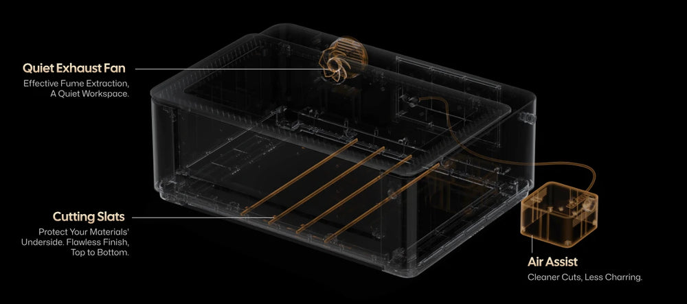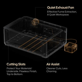 When cutting materials, placing the material on the cutting slats allows for more effective dissipation of heat and smoke generated during the cutting process. This reduces burn marks on the back of the material and ensures a clean, neat cut edge.