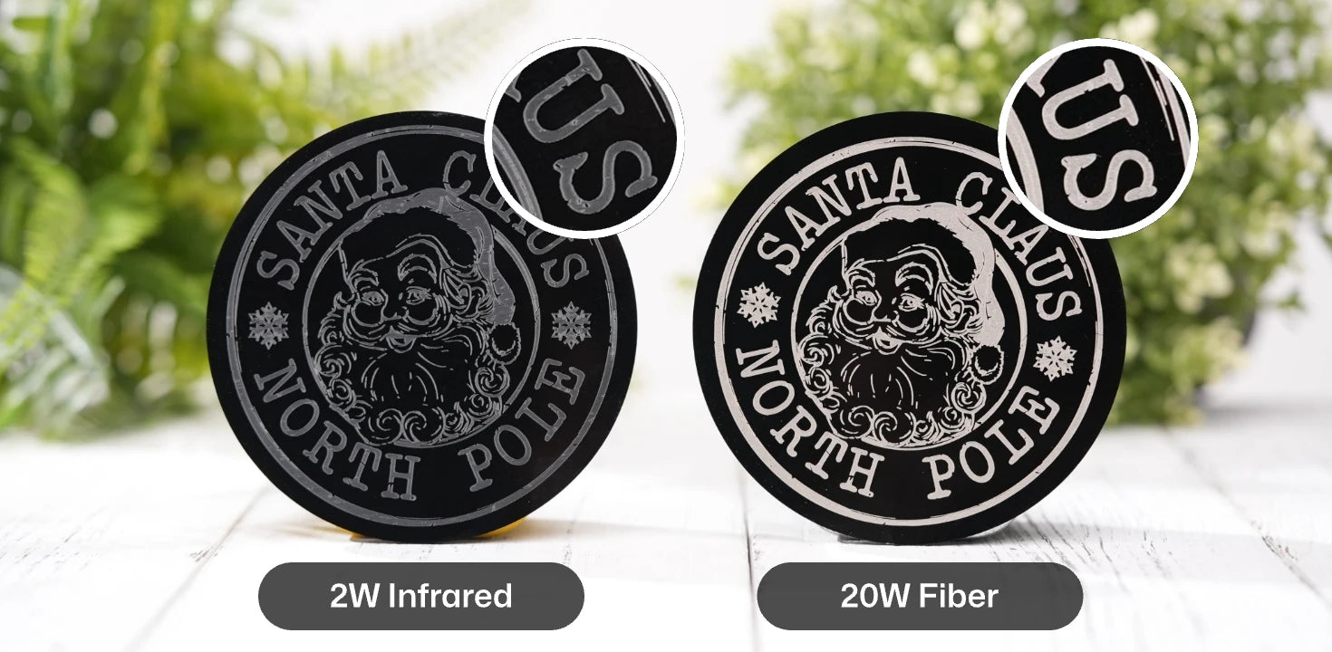 Diode lasers perform best on wood, dark acrylic, leather, slate, glass, ceramic, etc., while fiber lasers can engrave clearly on all-metals(stainless steel, aluminum, gold, silver, iron, platinum) and plastic.